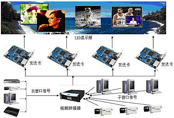 超大LED全彩屏带载方案中,整个图像信号来自于多张LED同步发送卡。这就需要使用LED视频拼接器同时接受并处理多路视频、图形信号,进行融合并在全彩LED显示屏上显示。