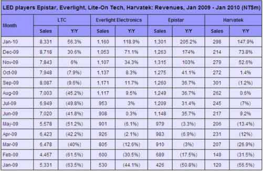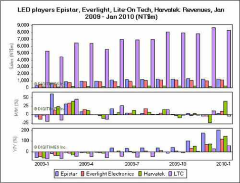 到2010年2月,台湾LED芯片制造商晶元光电(Epistar)与LED封装厂亿光电子(Everlight Electronics)、光宝科技(Lite-On Technology)和宏齐(Harvatek)营收均出现明显的同比增长态势,主要是由于液晶电视用LED背光源(BLU)的需求强劲。